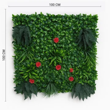 This elegant 100×100 cm artificial wall panel blends lush tropical greenery with vibrant red roses for a bold and luxurious aesthetic. Featuring realistic ferns, layered dracaena, and dense foliage, it offers depth and contrast that enhances any modern space. Crafted from UV-resistant materials, it maintains its vivid colors indoors or outdoors. Ideal for feature walls, event backdrops, or home interiors that seek a touch of nature-inspired sophistication.