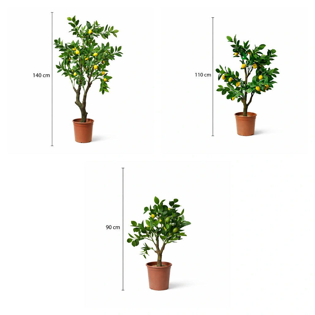 This artificial lemon tree collection brings a fresh Mediterranean feel to interiors with vibrant green leaves and realistic yellow lemons. Designed with natural-looking trunks and a balanced, full shape, each tree adds color and life without the need for watering or sunlight. Available in three sizes—90 cm, 110 cm, and 140 cm—it suits a variety of spaces, from compact corners to more open areas. Perfect for adding a cheerful, elegant touch year-round, these trees combine realism, style, and effortless maintenance