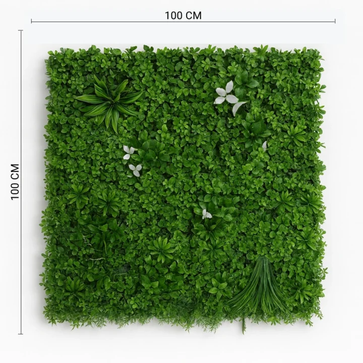 This 100×100 cm artificial tropical wall panel features a dense arrangement of mixed leaves in varying shapes and shades of green, accented with soft white blossoms for a natural, refreshing look. Designed from durable, UV-protected materials, it brings the beauty of greenery indoors or outdoors without maintenance. Perfect for modern interiors, cafes, and event backdrops, the panel delivers a lush, lifelike texture that enhances any decor style.