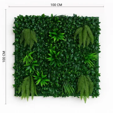 This premium 100×100 cm artificial wall panel combines tropical ferns, glossy foliage, and lush dracaena-style leaves for a striking, realistic look. Designed with UV-resistant materials, it maintains its color and texture indoors or outdoors. The mix of plant varieties adds natural depth and vibrancy, making it ideal for accent walls, event backdrops, and commercial interiors. Its bold, dense greenery instantly transforms spaces into refreshing, nature-inspired environments.