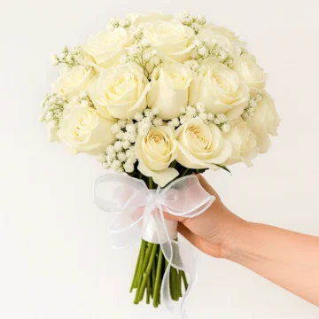 Bloom Chic is an elegant and timeless bouquet featuring fresh white roses paired with delicate baby?s breath for a soft, romantic finish. Wrapped with a sheer white ribbon, this bouquet embodies purity, grace, and effortless beauty. Perfect for weddings, engagements, anniversaries, or classic celebrations, it brings a touch of sophistication to any moment. Its clean color palette and refined design make it ideal for those who appreciate minimalistic yet luxurious floral styling.