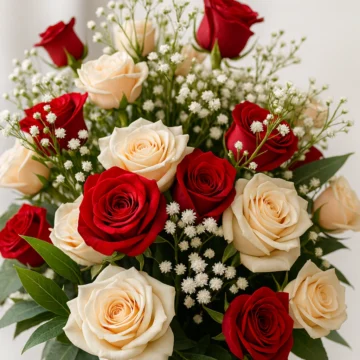 Bright Beauty is an elegant arrangement featuring 20 premium roses in a stunning blend of deep red and soft cream tones. Accented with delicate baby?s breath and lush green foliage, this arrangement offers a rich contrast that highlights the romance and sophistication of each bloom. Perfect for gifting, celebrations, or enhancing any interior space, it brings warmth, beauty, and charm to every setting. Bright Beauty is ideal for expressing love, gratitude, or admiration with a timeless floral touch.