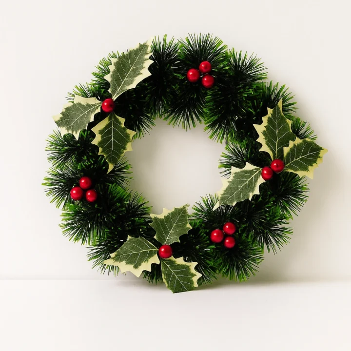 The Christmas Wreath 2560 is a charming festive accent featuring lush green pine needles adorned with variegated holly leaves and clusters of glossy red berries. Its minimalist yet elegant design captures the natural beauty of traditional Christmas decor, perfect for doors, windows, or wall displays. Bring warmth and classic cheer to your holiday setup with this timeless piece.