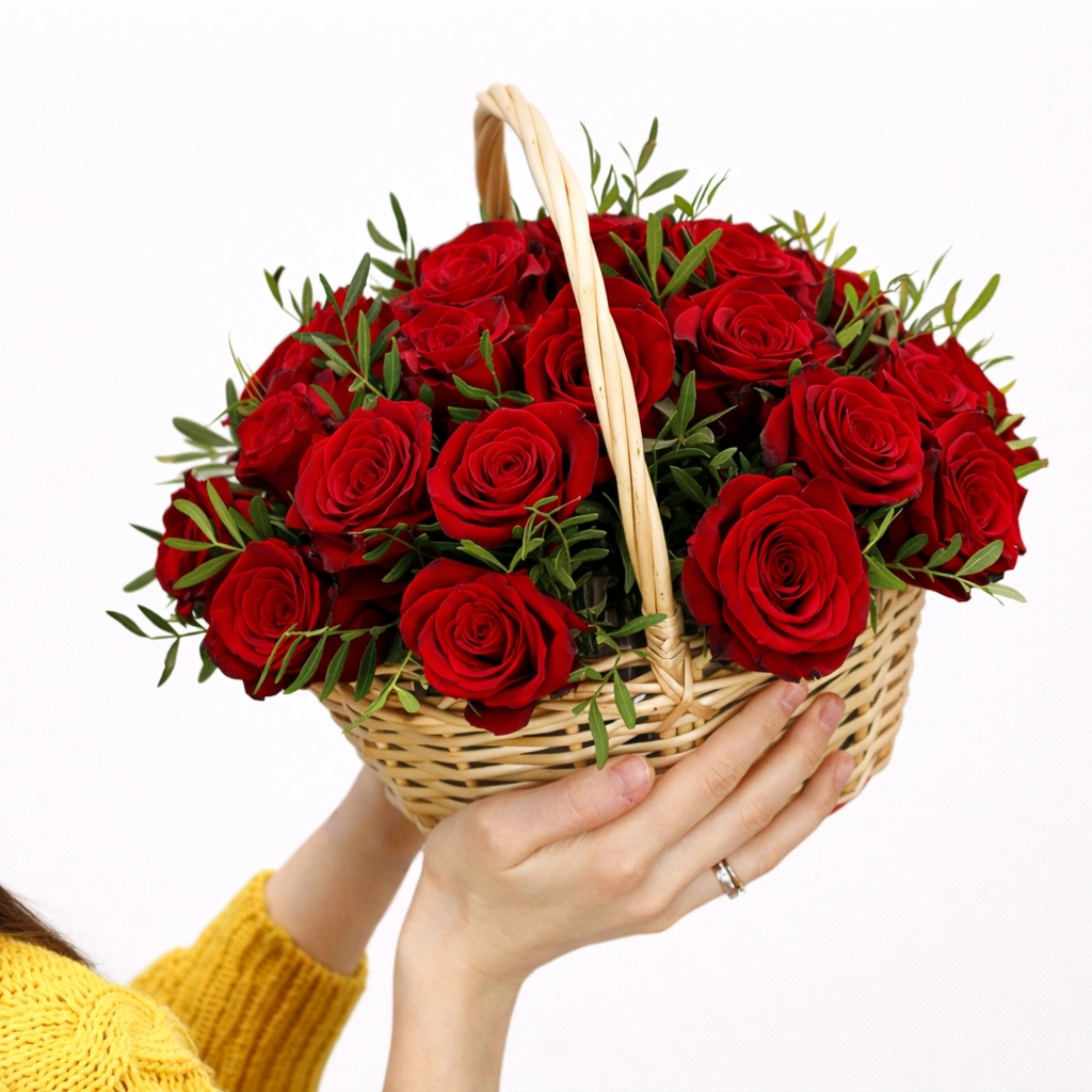 This charming handheld basket is filled with a rich arrangement of fresh red roses, carefully placed to create a full, balanced, and naturally elegant floral display. Each rose reflects deep love, admiration, and timeless passion, while the surrounding fresh green foliage adds texture and contrast. Presented in a natural woven basket with a sturdy handle, this design blends classic romance with a warm, handcrafted feel. It is a refined yet heartfelt floral gift that speaks powerfully through simplicity, beauty, and emotional depth.