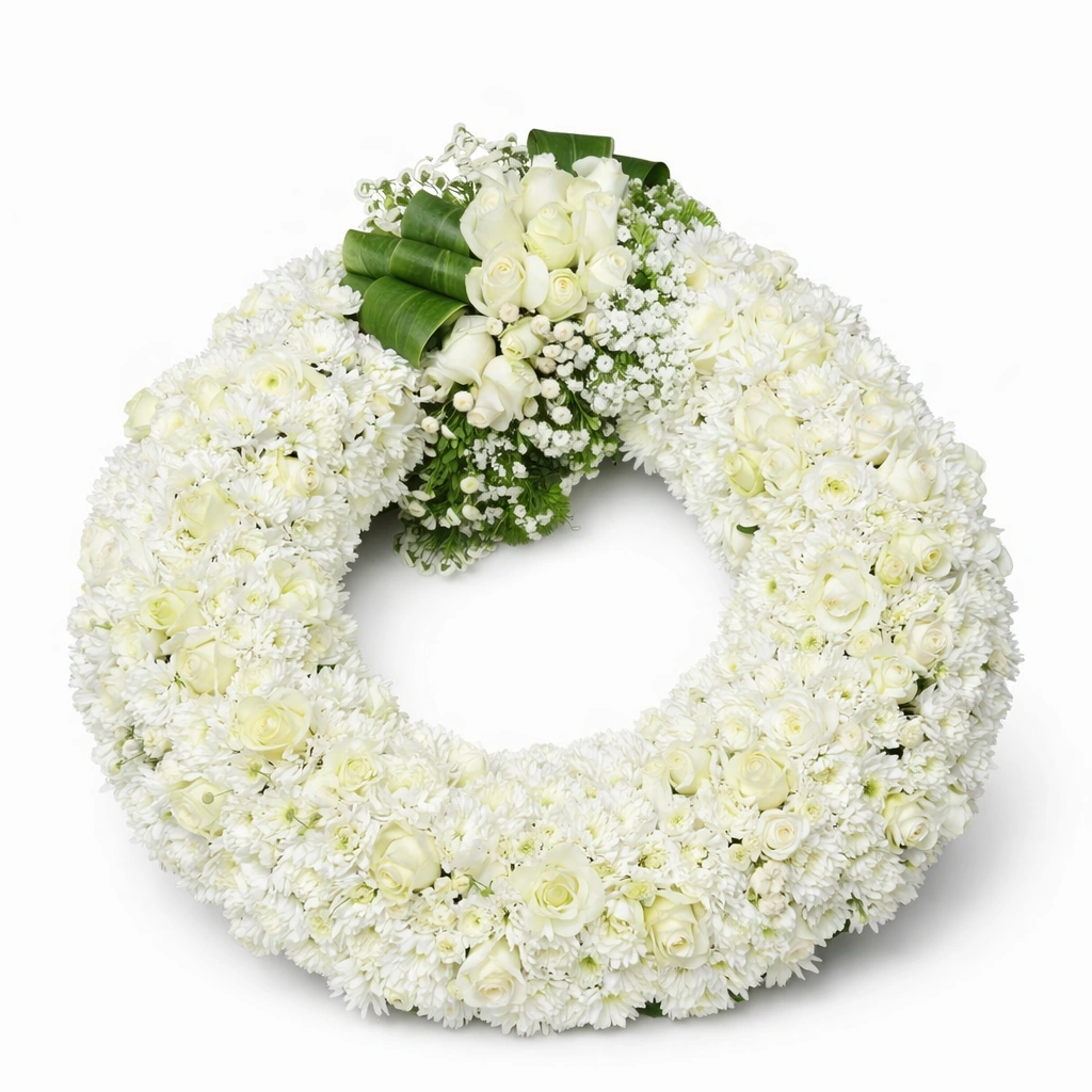 This timeless wreath features a full ring of fresh white roses, symbolizing purity, respect, and remembrance. Carefully arranged in a circular form, it represents eternity and the enduring nature of love. Accented subtly with soft greenery, the design maintains a clean and graceful appearance. Perfect for funeral services or memorial displays, this wreath offers a heartfelt way to honor a loved one while expressing sympathy and compassion with understated elegance.