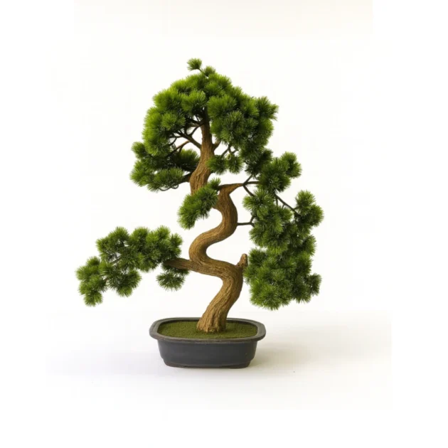 This elegant bonsai tree showcases a gracefully twisted trunk with dense green foliage, perfectly balanced in a sleek black ceramic pot. The realistic bark texture and compact needle-like leaves highlight fine craftsmanship, making it an exquisite centerpiece for both modern and traditional interiors.
