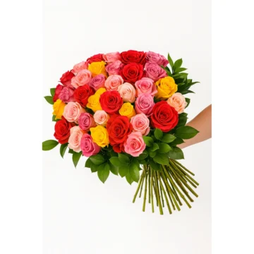 Day Light Harmony is a bright, joyful bouquet made from fifty mixed roses in shades of red, pink, yellow, lilac, and cream. Each bloom adds a soft, cheerful glow, creating a vibrant and expressive arrangement perfect for celebrations, gratitude, or simply uplifting someone?s day. The fresh greenery enhances the lively color palette, giving the bouquet a natural, sunny presence. Handheld and beautifully balanced, it reflects harmony, warmth, and pure floral charm.