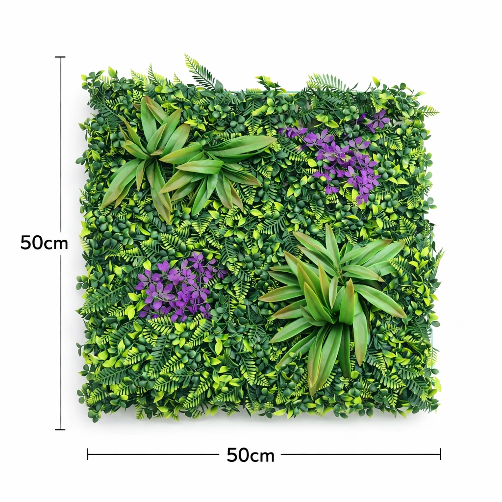 Vibrant artificial green wall panel featuring lush greenery accented with purple flowers and tropical leaves. Ideal for decorative walls, event backdrops, cafes, and stylish interior vertical garden designs.