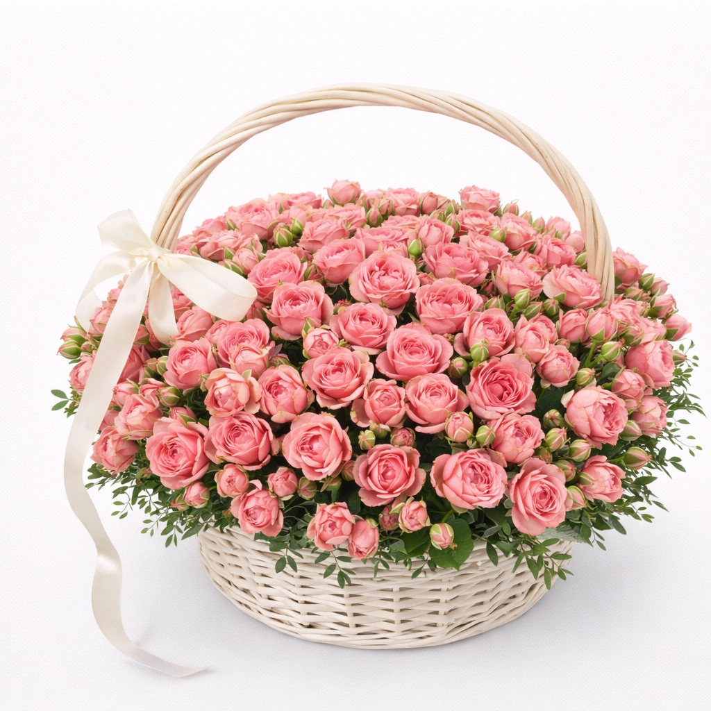 This elegant garden-style basket is filled with an abundant arrangement of fresh pink spray roses, carefully layered to create a lush, rounded, and naturally flowing floral display. Each spray rose features multiple soft blooms and buds, adding depth, texture, and a charming sense of fullness. Accented with fresh green foliage and presented in a classic white woven basket with a delicate ribbon, this arrangement radiates grace, warmth, and refined beauty. It is a timeless floral gift that expresses love, appreciation, and gentle sophistication for memorable moments and heartfelt occasions. Baby Roses + Basket