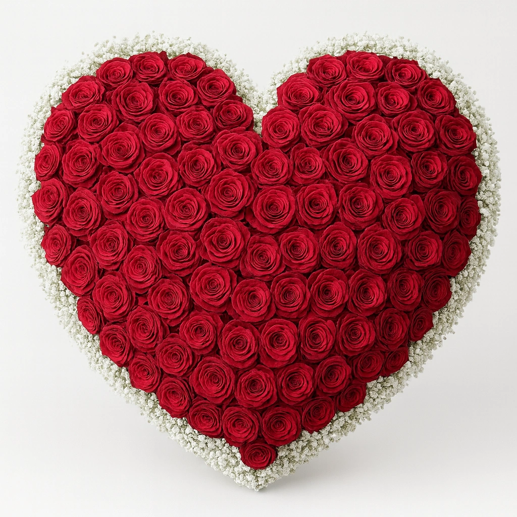 Endless Love is a breathtaking heart-shaped arrangement handcrafted from 150 premium red roses, bordered with delicate white baby?s breath for a soft, romantic finish. Each rose is carefully placed to create a full, luxurious shape that symbolizes passion, devotion, and timeless affection. This grand design is perfect for anniversaries, proposals, or any moment meant to leave an unforgettable impression. Its rich color and elegant form make it a striking centerpiece that speaks pure love without a single word.