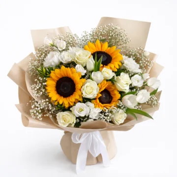 This naturally balanced bouquet combines bright sunflowers with soft white roses, delicate astoma (lisianthus), and airy baby’s breath, creating a fresh and harmonious floral arrangement. Designed to stay true to real flower sizes and natural fullness, the bouquet feels rich yet honest, without exaggeration. Wrapped in warm beige paper and finished with a simple white ribbon, it highlights the contrast between golden yellow and clean white tones. Ideal for cheerful celebrations, thoughtful gifts, or heartfelt moments, this bouquet delivers warmth, elegance, and freshness in a genuinely crafted, realistic presentation.