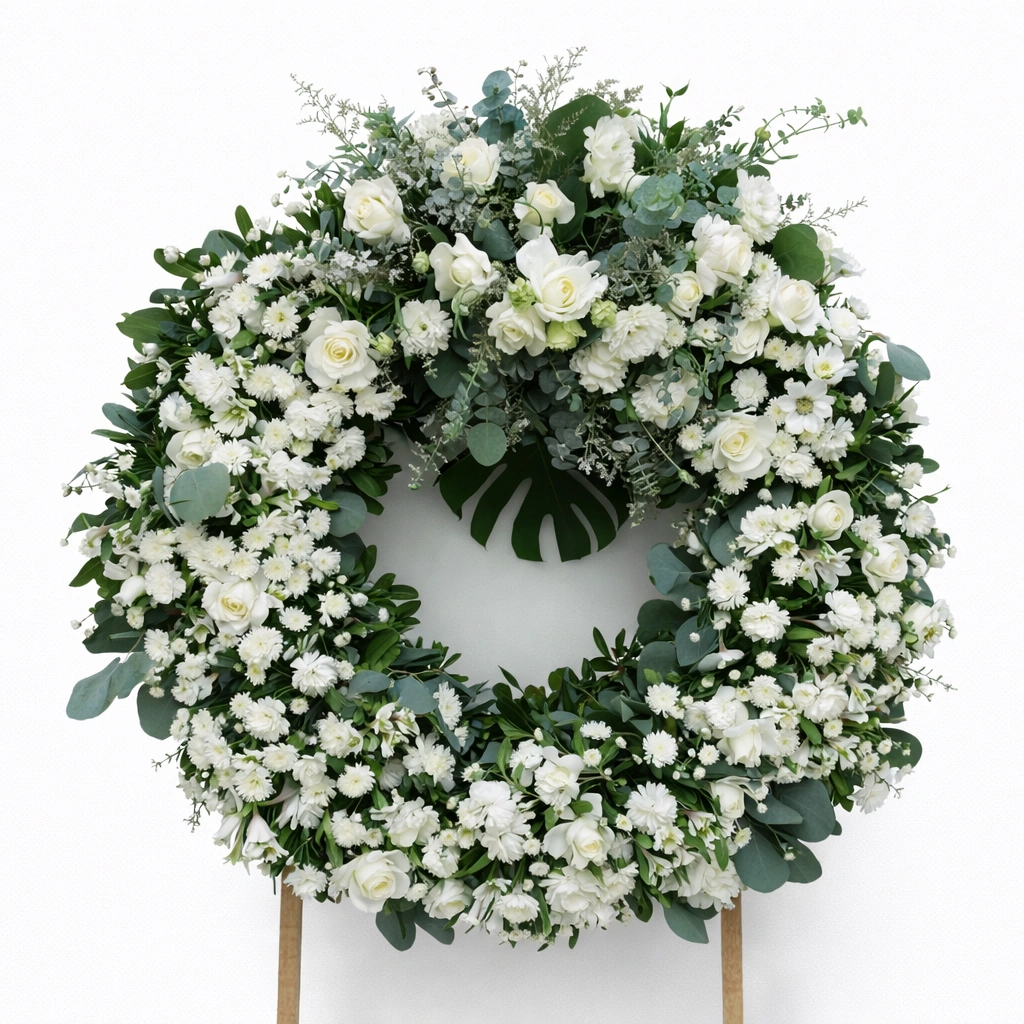 A lush standing wreath featuring a harmonious blend of white flowers such as roses and chrysanthemums, paired with rich green foliage. Elevated on a stand, it creates a prominent and respectful display at memorial services. The combination of textures and tones conveys peace, renewal, and remembrance. This arrangement is ideal for formal settings, offering a dignified and impactful tribute that honors life and legacy.