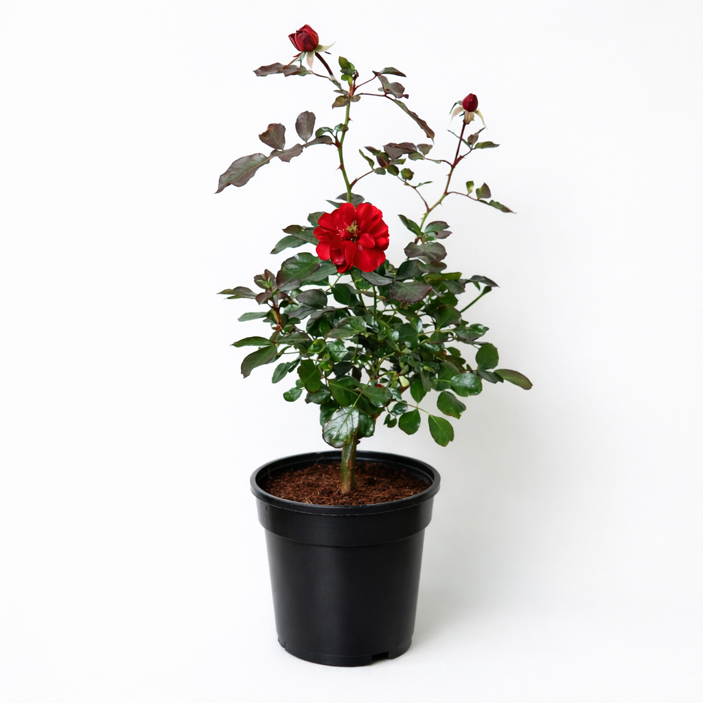 This Joury red rose plant is a real, naturally grown flowering rose presented in a simple 22 cm nursery pot. It features healthy green foliage, slender natural stems, and a vibrant red rose bloom with additional buds, reflecting true growth and proportions without artificial enhancement. The plant is kept realistic in size and shape, making it an affordable and genuine choice for everyday enjoyment or small gifting. Its clean, natural look highlights the beauty of the rose itself while remaining easy to place and maintain in both indoor and outdoor settings.