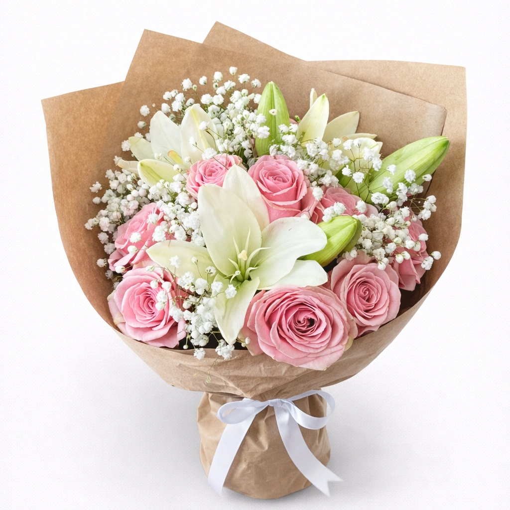 The Lily Rose Bouquet combines the timeless beauty of 8 roses with the graceful elegance of 2 lilies, all beautifully wrapped in refined sofeel. This classic floral pairing creates a bouquet that feels both romantic and sophisticated. The roses symbolize love and admiration, while lilies add fragrance and elegant shape to the arrangement. Together they form a stunning bouquet that suits romantic gestures, anniversaries, or meaningful celebrations. It is a graceful expression of affection and refined floral beauty.