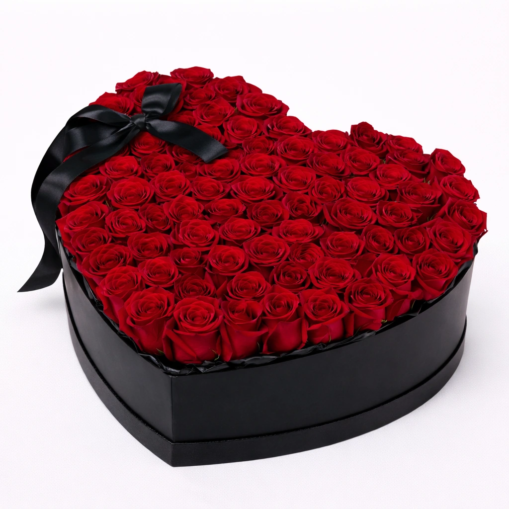 This luxurious heart-shaped box arrangement features premium fresh red roses meticulously placed to create a dense, elegant display of passion and romance. Presented in a sleek black heart box and finished with a sophisticated satin ribbon, it delivers a bold and refined statement of love. Each rose is selected for its deep color, freshness, and perfect bloom, ensuring a lasting impression. Ideal for expressing powerful emotions, this exclusive floral gift embodies elegance, intensity, and timeless romantic charm.