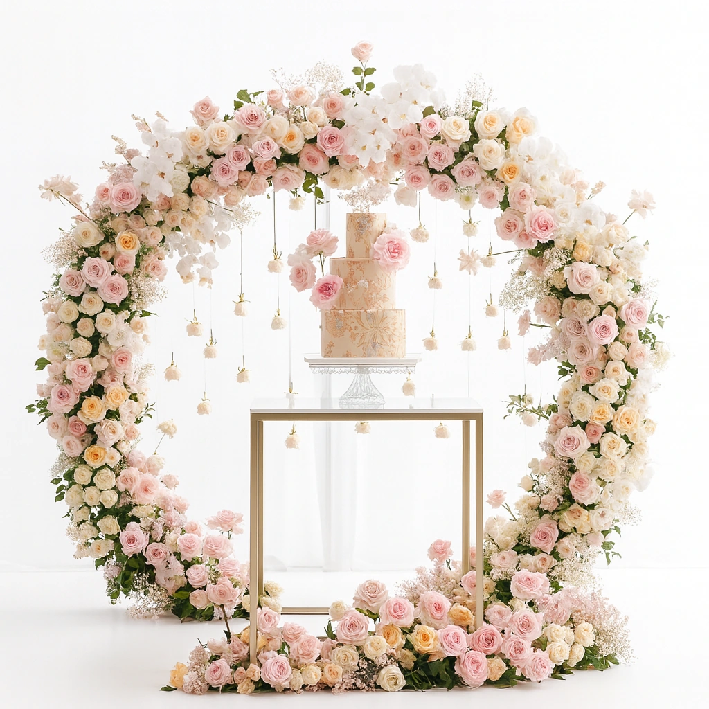 This luxury wedding floral arch features a breathtaking blend of blush roses, creamy white blooms, delicate orchids, and soft greenery arranged to perfection. The circular arch frames a beautifully crafted wedding cake displayed on a modern glass table, with suspended mini florals adding an ethereal touch. Designed to elevate any ceremony or reception, this setup creates a dreamy, romantic atmosphere ideal for capturing unforgettable moments and enhancing elegant wedding themes.