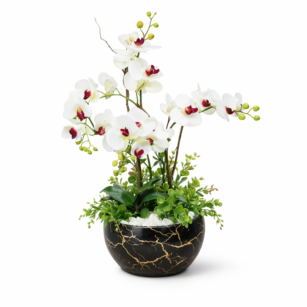 This luxurious artificial Phalaenopsis orchid arrangement is designed to make a bold yet elegant statement in any interior. Featuring realistic white blooms with rich red centers, delicate buds, and lush layered greenery, it delivers the beauty of fresh orchids without any maintenance. The striking black marble-style pot with subtle gold veining adds a premium, contemporary touch that elevates the entire display. Perfect for modern spaces seeking timeless sophistication, this orchid arrangement remains flawless year-round and brings balance, calm, and refined style to both residential and commercial settings.