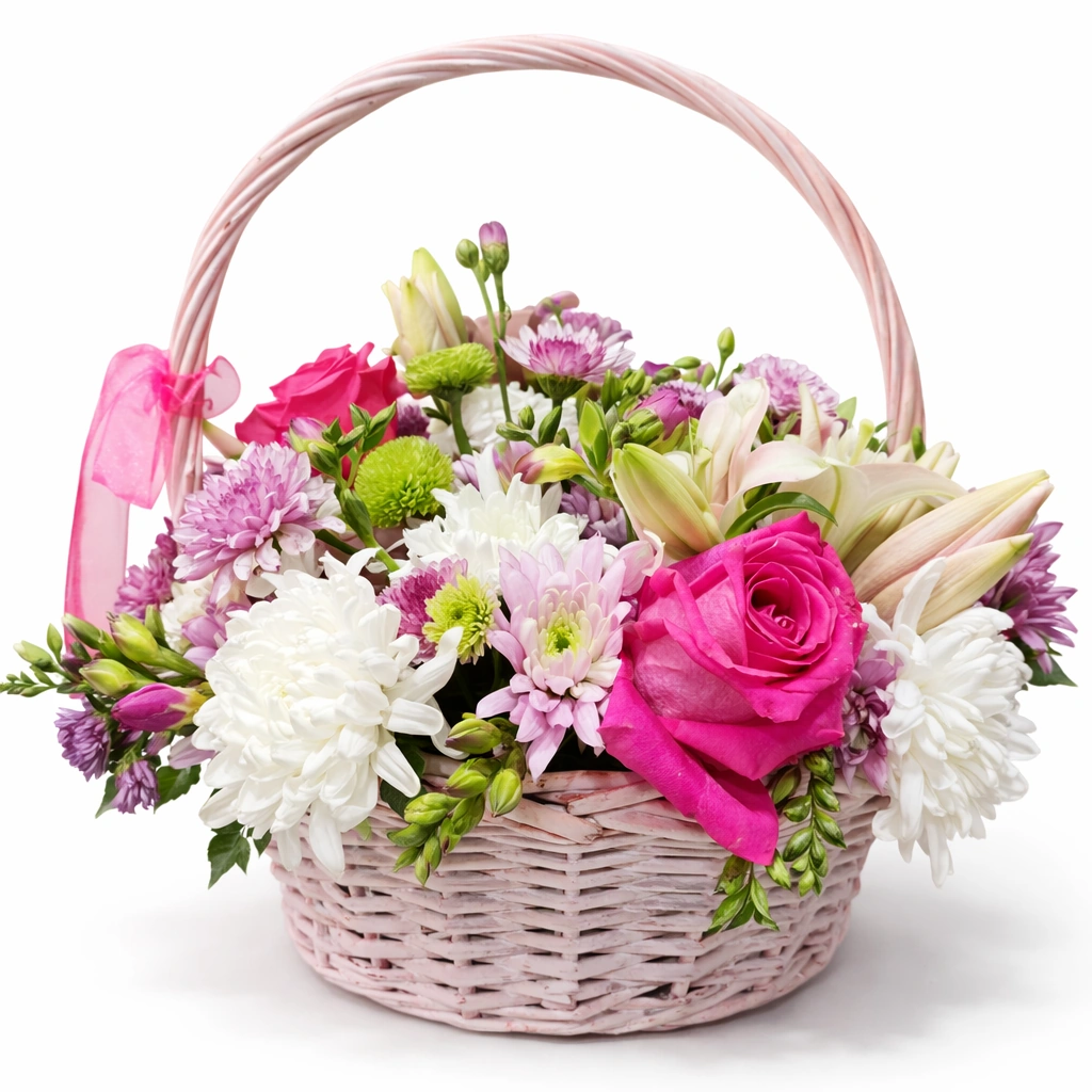 This elegant Mother’s Day basket features a beautiful mix of pink roses, white lilies, chrysanthemums, and soft filler flowers. The arrangement creates a gentle and loving aesthetic, perfect for expressing appreciation. The woven basket and pastel tones enhance its charm, making it suitable for both gifting and decor. Ideal for brightening living rooms or bedside tables, this arrangement brings freshness and warmth. Its balanced combination of blooms offers a classic yet graceful floral experience.