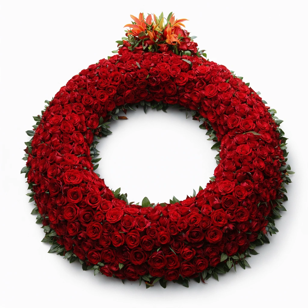 A bold and meaningful wreath composed entirely of deep red roses, symbolizing love, respect, and remembrance. The rich color expresses deep emotions and heartfelt condolences, making it a powerful tribute. Arranged in a full circular design, it represents eternal love and connection. Ideal for honoring someone deeply cherished, this wreath provides a striking and emotional expression of sympathy during times of loss.