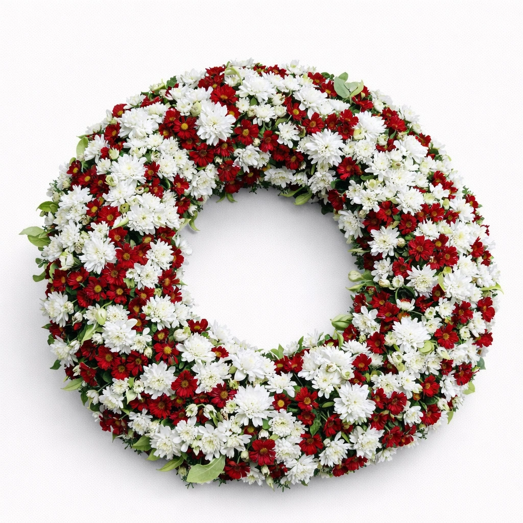 A striking wreath combining vibrant red flowers with soft white blooms, symbolizing love, respect, and remembrance. The contrast of colors creates a powerful visual tribute, expressing deep emotions and heartfelt condolences. Arranged in a classic circular form, it represents eternal connection and enduring love. This piece is ideal for honoring someone deeply cherished, offering a bold yet respectful expression of sympathy at funerals and memorial services.