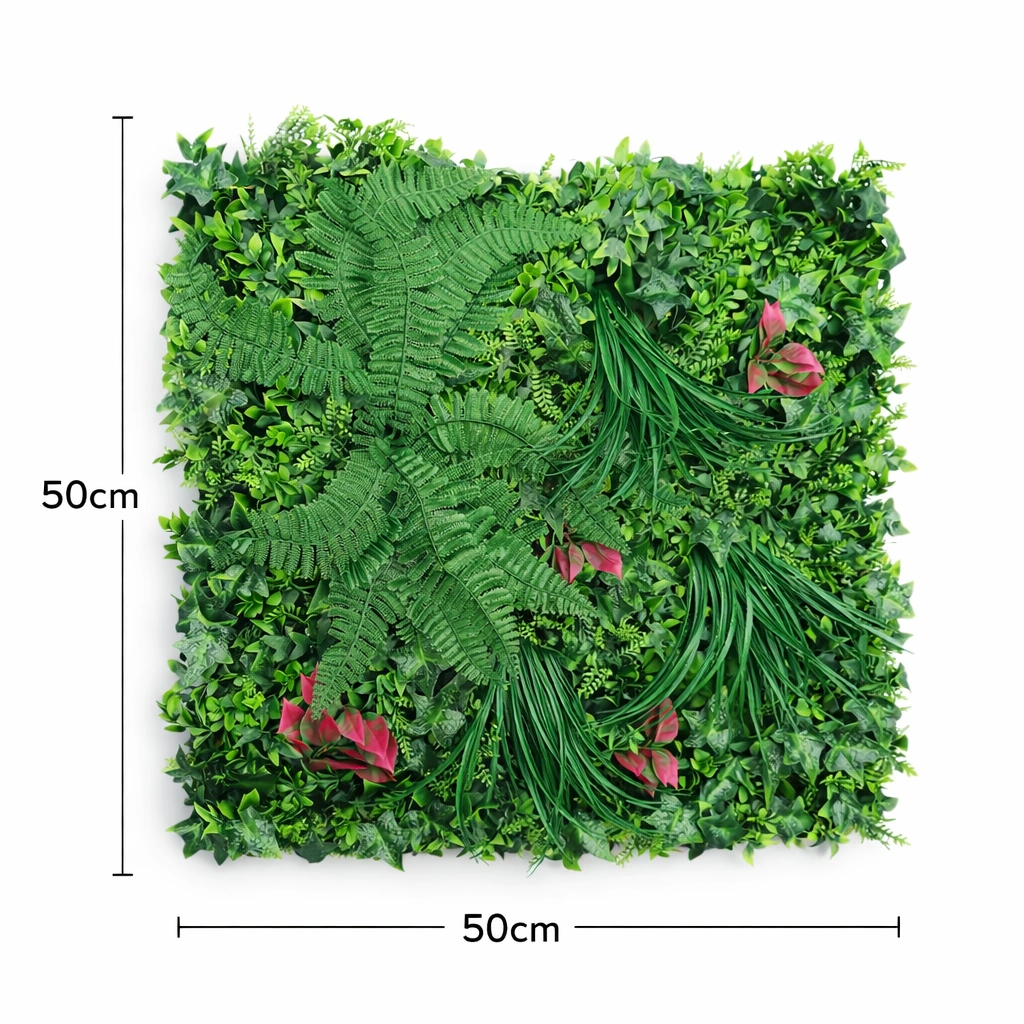 Stylish tropical artificial green wall panel featuring lush fern leaves and layered greenery. Ideal for modern decor, indoor feature walls, commercial spaces, and decorative vertical gardens with a vibrant botanical appearance.