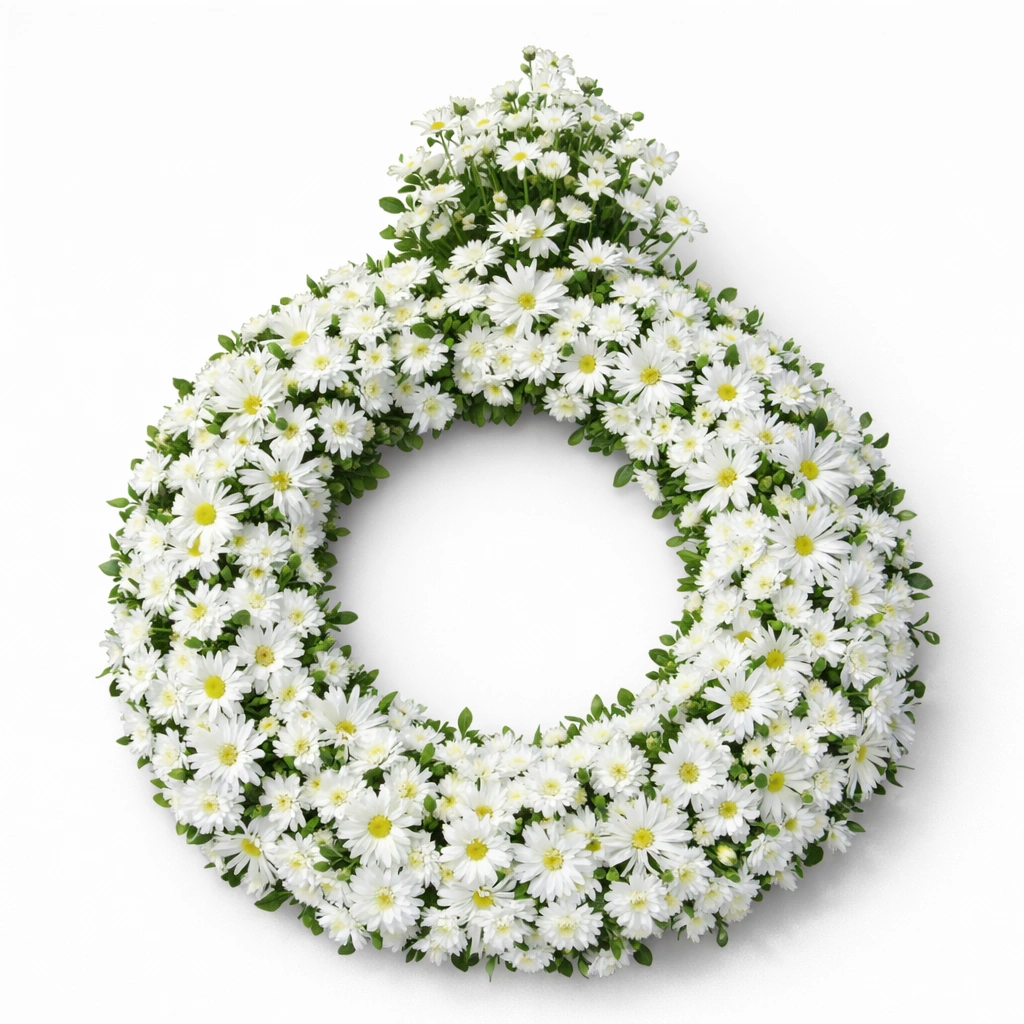 Designed in a teardrop shape, this wreath features delicate white daisies arranged to symbolize innocence, purity, and heartfelt sorrow. The flowing shape adds a sense of movement and emotion, representing tears and remembrance. Its light and natural appearance brings a calming presence to memorial services. This piece is ideal for expressing sincere condolences while maintaining a gentle and comforting aesthetic.