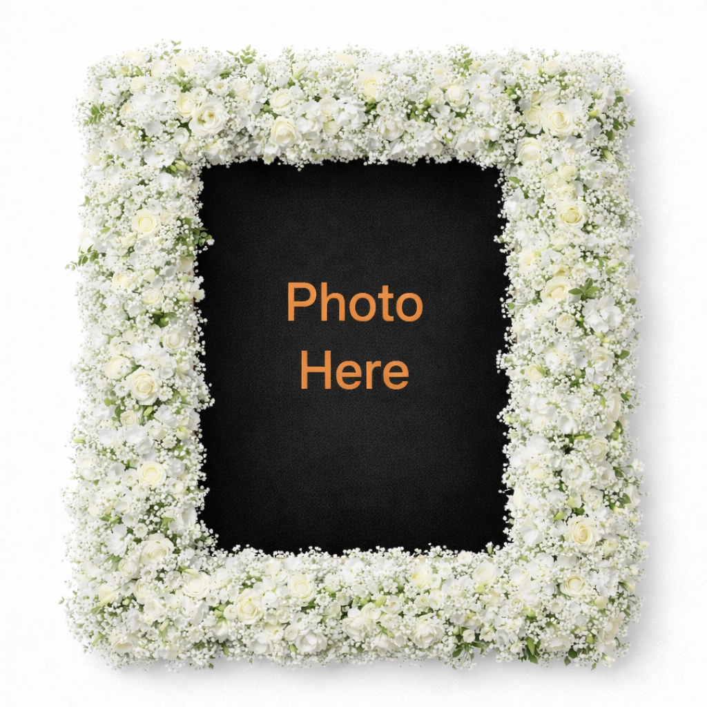 A refined floral photo frame arrangement crafted with delicate white chrysanthemums and carnations, designed to surround and honor a cherished photograph. This piece symbolizes remembrance and eternal love, making it a deeply personal tribute. Its soft white blooms create a peaceful and respectful tone, suitable for memorial services or funeral displays. Ideal for showcasing a loved one’s image, this arrangement offers a heartfelt way to celebrate their life and preserve their memory with grace.