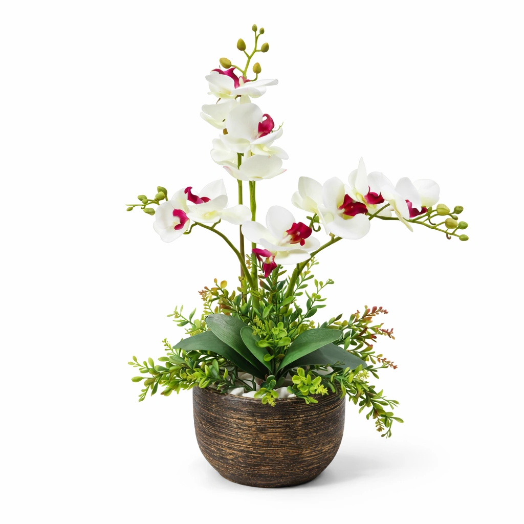 This elegant artificial Phalaenopsis orchid arrangement brings refined beauty and lasting freshness to any interior. Designed with lifelike white blooms accented by deep red centers, natural-looking buds, and rich green foliage, it captures the charm of real orchids without any maintenance. The textured rustic pot adds warmth and character, making the arrangement both modern and timeless. Perfect for styling spaces that need a sophisticated yet calming touch, this premium artificial orchid stays flawless all year and effortlessly elevates residential or commercial decor.