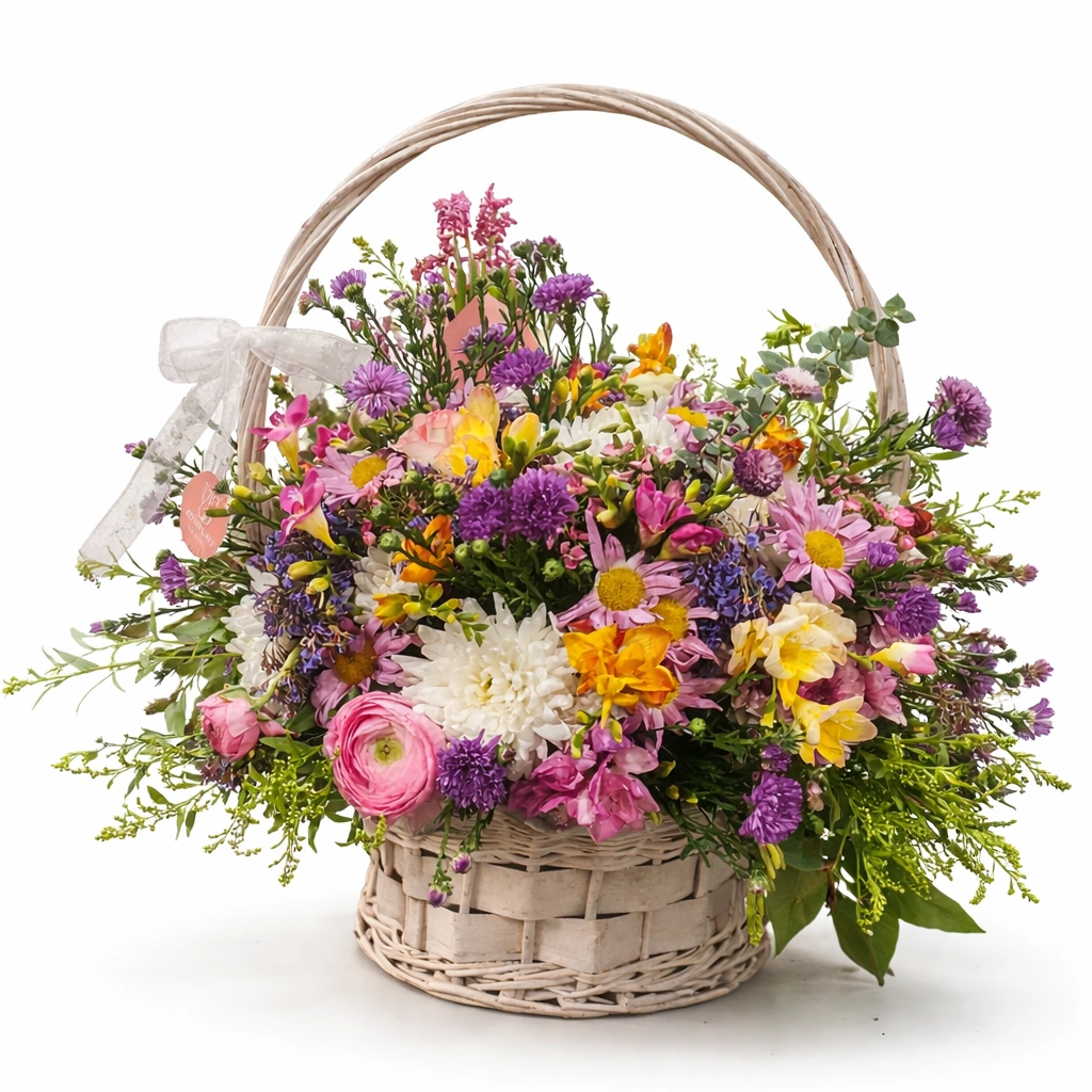 A vibrant basket filled with a lively mix of seasonal wildflowers, including daisies, mini roses, chrysanthemums, and colorful fillers. The natural, garden-inspired design creates a cheerful and organic look. Perfect for Mother’s Day, this arrangement feels fresh and full of life. The neutral basket base allows the colors to stand out beautifully. Ideal for tabletops or entryways, it adds a burst of color and joy to any indoor space.